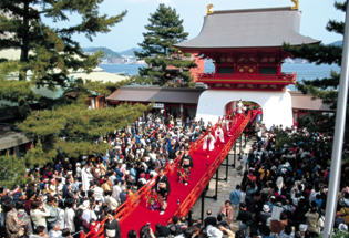 壇ノ浦の戦いで亡くなった安徳天皇を祀る神社です。安徳天皇の命日に開催される「先帝祭」(毎年5月2日から5月4日)では外八文字道中や源平合戦の再現など、数多くの催し物が行われます。また、赤間神宮は物語「耳なし芳一」の舞台でもあります。